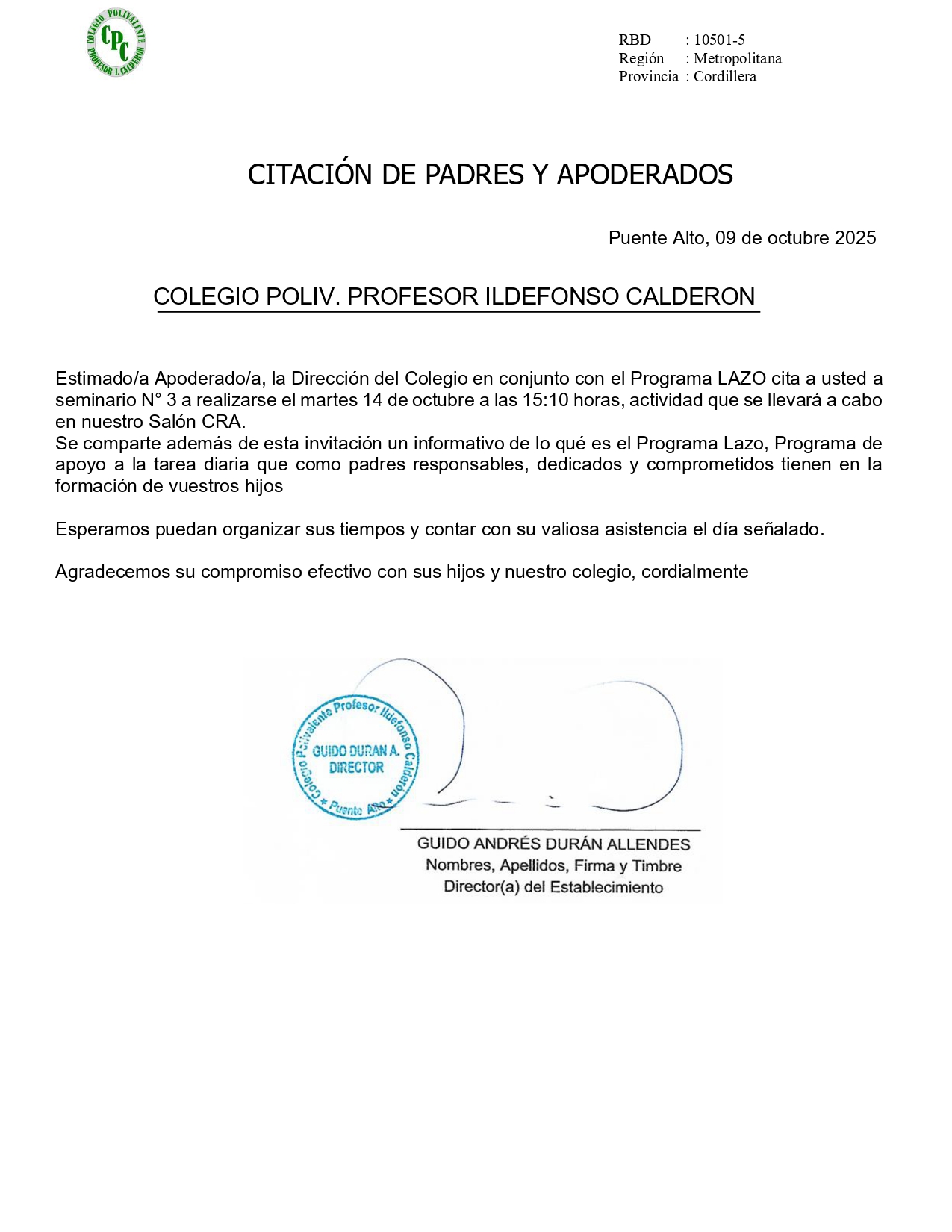 CITACIÓN DE PADRES Y APODERADOS 08/10/2025 admin Navegación de entradas Entrada anteriorActividades Octubre!