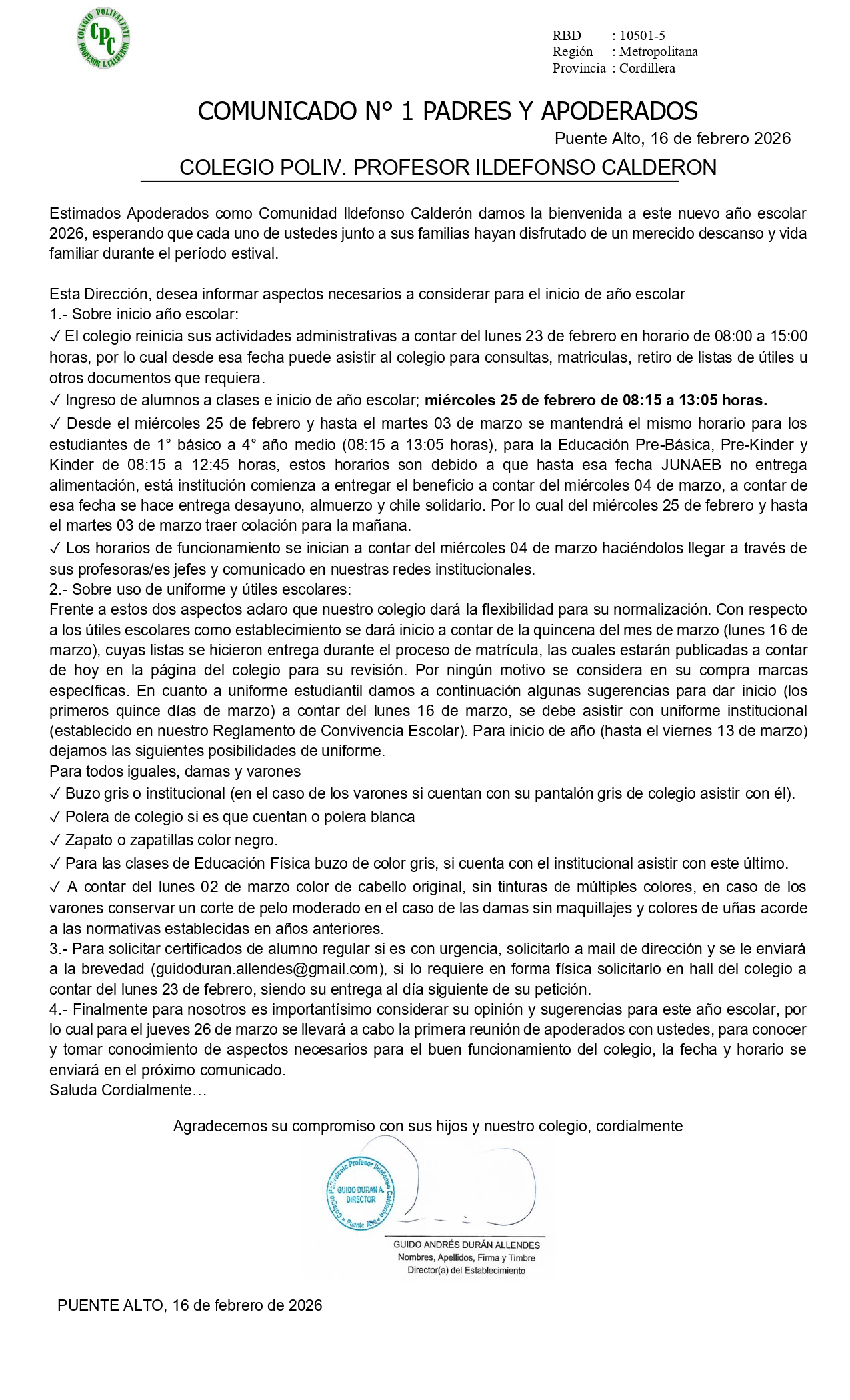 Estimados Apoderados como Comunidad Ildefonso Calderón damos la bienvenida a este nuevo año escolar